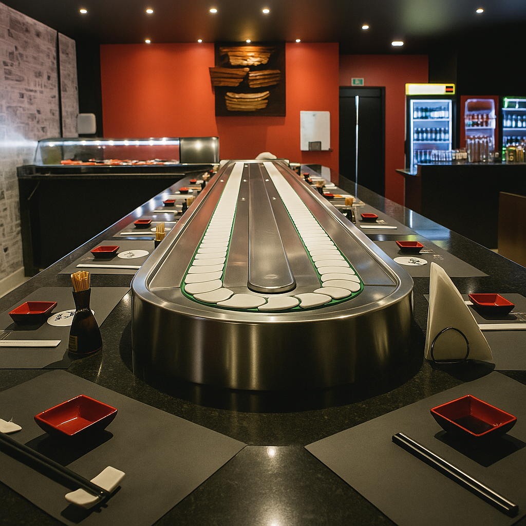 A esteira transportadora de sushi tipo kaiten é ideal para restaurantes japoneses, rodízios e buffets que desejam modernizar o atendimento com design elegante e eficiente.